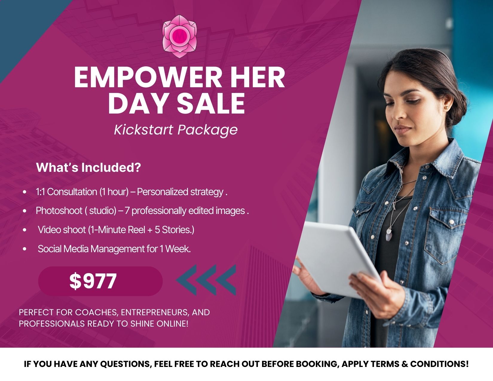 Empower your brand and step into visibility with our Women’s Day Kickstart Package, designed to elevate your presence with professional visuals and strategic content. 💖 What’s Included?✅ 1:1 Consultation (1